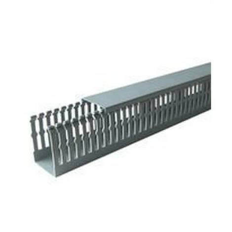 Canal TABLE 60×25 ajouré. Parois perforées – Conformes à la norme UNE-EN 50085-2-3 – PVC M1 couleur gris RAL 7030 – Perforations latérales au pas de 10 mm – Longueur : 2 m – Hauteur : 60 mm – Largeur : 25 mm. Caniveaux pour caisson PVC.