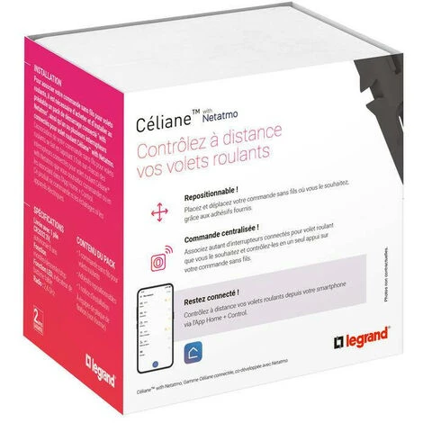 Legrand propose cette commande sans fils connectĂ©e, pour volet roulant qui vous permettra de crĂ©er une installation connectĂ©e dans votre logement. Vous pouvez complĂ©ter votre installation avec d’autres prises, interrupteurs, micromodules d’Ă©clairage et commandes sans fil CĂ©liane with Netatmo.