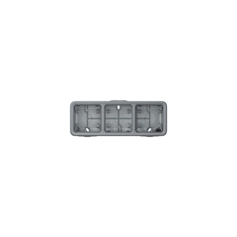 Boîte de surface horizontale 3 positions PLEXO gris. Coffrets à cônes 2 et 3 éléments – Coffrets ouverts, sans cloison pour faciliter le câblage et recevoir les embases pré-câblées de 3 éléments – 2 cônes supérieurs, 1 entrée – 1 cône inférieur, 2 sorties – Gris. Plexo – Mécanismes étanches IP 55 – modulaires – en saillie – boîtiers et supports pour plaques – Boîtiers et supports avec façade de finition inclus – Clic sonore pour s’assurer que la plaque a été correctement fixée – Ils admettent des mécanismes modulaires – Boîtiers pouvant être équipés d’une borne raccordement Nylbloc automatique, 2 conducteurs pour un éventuel raccordement supplémentaire – IP 55 – IK 07.