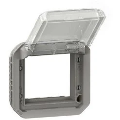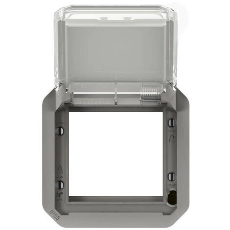Adaptateur Ă©tanche avec volet transparent Plexo permet d’intgĂ©rer les mĂ©canismes Mosaic 2 modules dans l’esthĂ©tique Plexo, Ă Ă©quiper d’un boitier pour montage en apparent ou d’une plaque support pour montage en encastrĂ© – finition gris