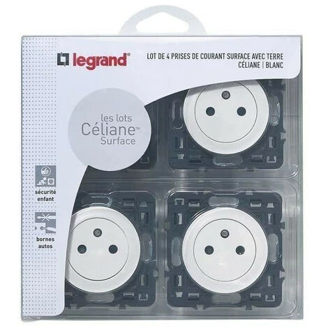 Lot 4 prises de courant avec terre 16A – LEGRAND Céliane – Affleurante – Puissance max : 3680W en 230V – NF – Couleur : blanc – A assembler avec plaque de finition – Fixation par vis ou griffes dans boîte a encastrer profondeur 40mm Batibox ou existante.