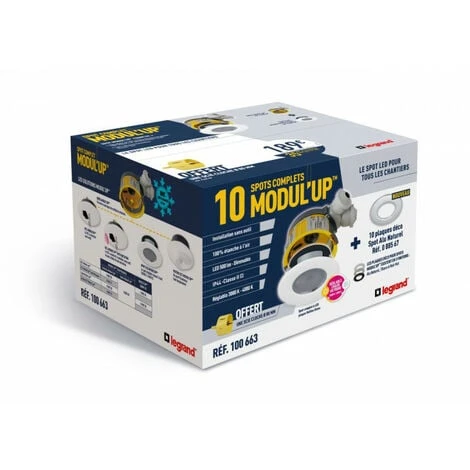 Distribox avec 10 spots dimmables complets (Spots – enjoliveurs), livré avec scie cloche diam 80 et boites Modul’up + 10 bagues de finition Alu Mat Métal