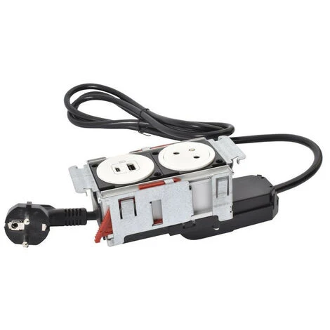 Disq’In Incara 2 postes équipé de 1 prise de courant Surface et 1 chargeur USB Type-A + Type-C finition blanc avec cordon 2m et fiche 2P+T – à encastrer dans le mobilier et à équiper d’une plaque de finition, fixation rapide et sans outil
