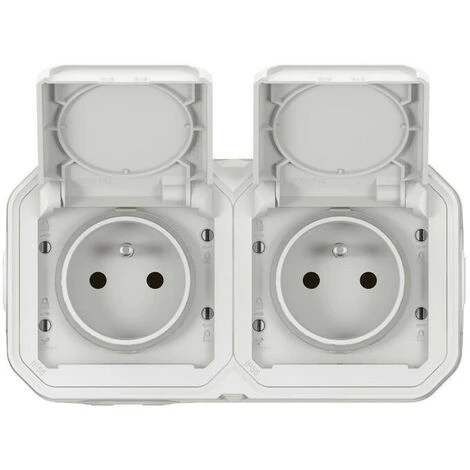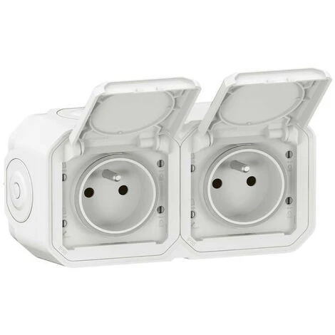 Double prise de courant avec terre étanche avec volet Plexo 16A 250V pour montage en horizontal, complète livrée avec boîtier saillie 2 postes pour montage en apparent – blanc