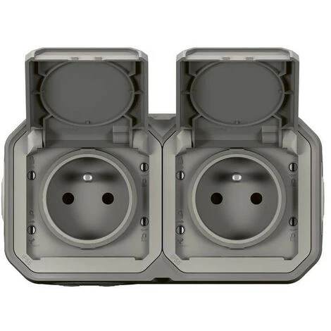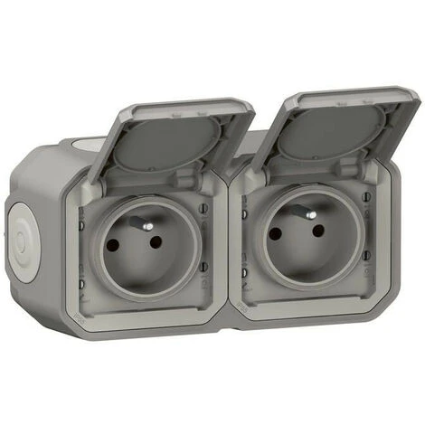 Double prise de courant avec terre Ă©tanche avec volet Plexo 16A 250V pour montage en horizontal, complĂšte livrĂ©e avec boĂźtier saillie 2 postes pour montage en apparent – gris