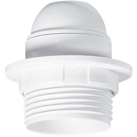 Douille de remplacement (pour équipement, lampes…) à usage domestique. Douille chemise demi filetée. Bague pour abat-jour, matière isolante. Installation sur raccord mâle Ø 10. Douille pour ampoules à vis Ø 27 mm (E 27). Puissance lampe : 150 W maximum.