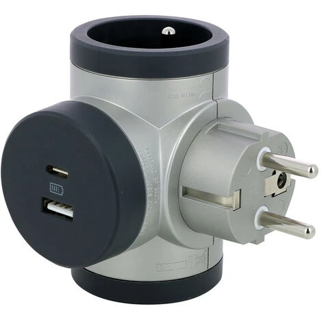 Fiche multiprise rotative 2 prises de courant laterales rotatives franco-belge. Couleur aluminum peint. Chargeurs USB Type A et C 15,0W. Pour un usage universel