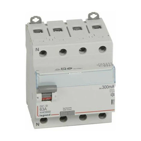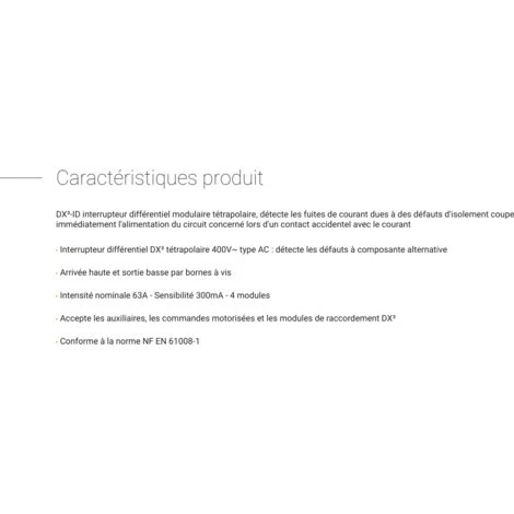 DXÂł-ID interrupteur diffĂ©rentiel modulaire tĂ©trapolaire, dĂ©tecte les fuites de courant dues Ă Â des dĂ©fauts d’isolement, coupe immĂ©diatement l’alimentation du circuit concernĂ© lors d’un contact accidentel avec le courant.