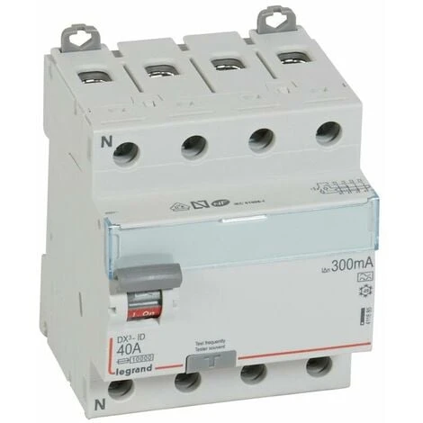 Interrupteur différentiel DX³ tétrapolaire 400V~ type A : détecte les défauts à composantes alternative et continue (circuits spécialisés : cuisinière, plaque de cuisson, lave-linge…) Arrivée haute et sortie basse par bornes à vis Intensité nominale 40A – Sensibilité 300mA – 4 modules