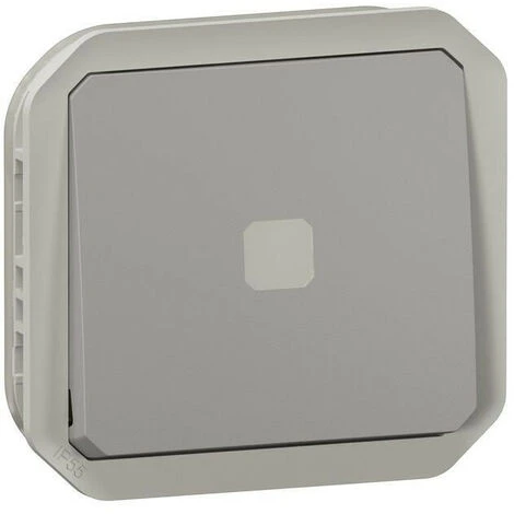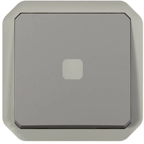 Interrupteur temporisé lumineux câblage 2 fils sans Neutre étanche Plexo 230V 50Hz à 60Hz IP55 IK05 avec temporisation réglable, à équiper de support plaque ou boîtier saillie, livré avec enjoliveur finition gris
