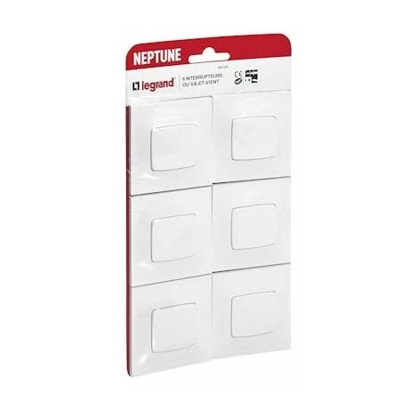 Simple, économique et résistante, la gamme Neptune de Legrand se caractérise par une finition blanche avec un design aux formes adoucies et aux contours affinés adaptés à tous les intérieurs. Produit : Lot de 6 interrupteurs va-et-vients 10A complet Neptune – Blanc. Un tout-en-un incontournable qui fait fonction d’interrupteur simple ou de va-et-vient s’il est associé à un second interrupteur