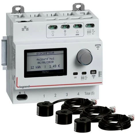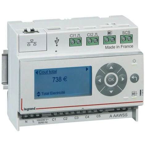 Compteur d’Ă©nergie rĂ©sidentiel IP pour visualisation des consommations Ă distance : mesure des consommations Ă©lectriques du logement sur 6 postes Ă l’aide des tores fermĂ©s fournis + mesure eau chaude, eau froide et gaz, compatible RT2012