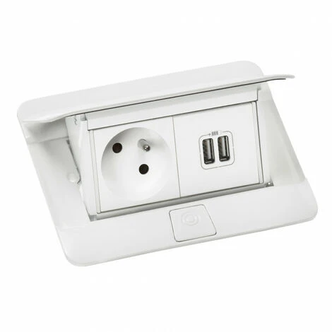 Pop up mobilier prĂ© – cĂąblĂ© avec 1 prise 2P+T 16A 250V~ et 1 chargeur double USB 2,4A – blanc brillant