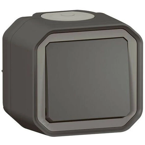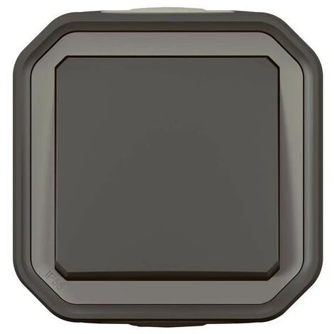 Poussoir NO Ă©tanche Plexo 10A IP55 IK08 livrĂ© complet avec boĂźtier Ă embouts pour fixation en saillie – anthracite