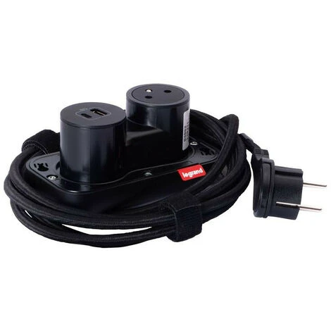 Prise de courant Surface et chargeur USB Type-A + Type-C mobile Electr’On Incara pour bureau et espace collaboratif 2 postes finition noir avec avec cordon 2m et fiche 2P+T – à composer, à équiper d’un habillage
