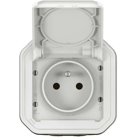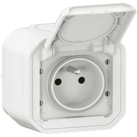 Prise de courant 2P+T étanche Plexo 16A 250V IP55 IK08 livrée complète avec boîtier 1 embout 2 sorties pour fixation en saillie – blanc