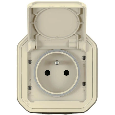 Prise de courant 2P+T Ă©tanche Plexo 16A 250V IP55 IK08 livrĂ©e complĂšte avec boĂźtier 1 embout 2 sorties pour fixation en saillie – sable