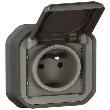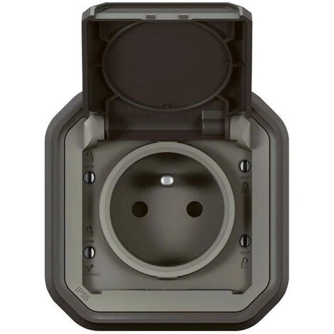 Prise de courant avec terre étanche avec volet Plexo 16A 250V complète livrée avec support plaque pour montage en encastré anthracite