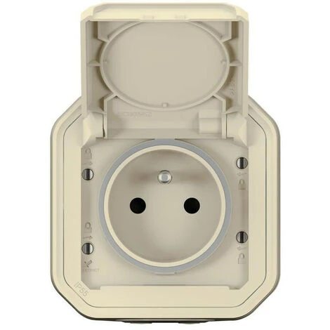 Prise de courant avec terre Ă©tanche avec volet Plexo 16A 250V complète livrĂ©e avec boĂ®tier saillie pour montage en apparent – sable