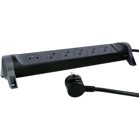 Multiprise 6 prises de courant affleurantes franco-belge. Multiprise rotative et fixable. Essentiellement pour un usage au bureau. Cordon en PVC noir de 3M de long et 1,5mm² de section.