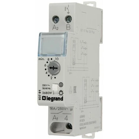 Minuterie d’escalier Legrand.Propriétés:- extrêmement silencieux- réglage de l’heure exacte- possibilité de réarmement à tout moment- résistance à 100 % à la tension permanente- courant max. des lampes néon 50 mA- interrupteur manuel pour la commutation éclairage minute vers éclairage permanent – largeur d’appareil: 1 unité modulaire de 17,5 mmCaractéristiques techniques:- 230 V, 50/60 Hz- commutation manuelle raccordement à 3/4 conducteurs- temporisation: 0,5 – 10 min.- contact à fermeture 250 V, 50/60 Hz, 16 A- charge de lampe à incandescence/halogène 230 V: 2000 W- charge de tube fluorescent (compensé en série): 1000 VA- charge de tube fluorescent (compensé en parallèle) max. 14 µF: 120 VA