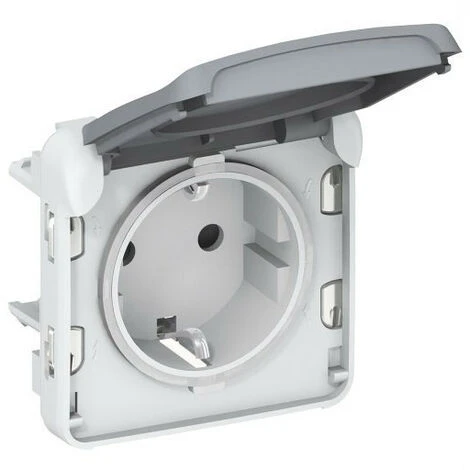 Prise de terre grise PLEXO I/O 2 pôles. Prises de courant 16 A – 250 V – Avec contact de terre latéral 2P T Bornes à vis – Gris. Plexo – Mécanismes étanches IP 55 – composable – prises de courant et prises différentielles – Les mécanismes sont livrés avec une façade finie – Installation avec des boîtiers de surface ou avec des plaques de support encastrées.