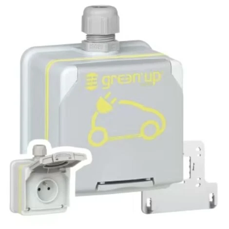 Prise de courant Green’up Access Ă©tanche pour recharge de vĂ©hicule Ă©lectrique – livrĂ©e complĂšte pour fixation en saillie avec boĂźtier avec presse-Ă©toupe ISO20 IP66 IK08 16A 230V Mode 2