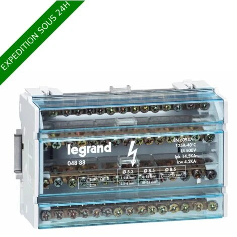 Répartiteurs modulaires monoblocs Fixation sur rail DIN ou sur platine par 2 visLivrés avec plaque arrière isolante et capots de protection face avant transparentsAcceptent le repérage CAB 3 sur chaque barreauPossibilité d’ajouter un bornier IP 2X pour augmenter le nombre de départs terre ou neutre (sauf réf. 0 048 77)Tétrapolaires à bornes Equipés de 4 barreauxEmbouts fournis pour raccordement 25 mm² soupleImax : 125 AConnexions par barreau rigide : 11 x 2,5 à 10 – 4 x 10 à 35 mm²Connexions par barreau souple : 11 x 1,5 à 6 – 4 x 6 à 25 mm²Icc crête : 14,5 kÂIcw : 4,2 kANombre de modules : 8 Caractéristiques générales: Répartiteurs modulaires monoblocs et associables – 40 à 250 ARépartition »standard »Raccordement avec ou sans embouts StarfixTenue au fil incandescent suivant EN 60695-2-11 : 960 °C sur les supports de parties actives