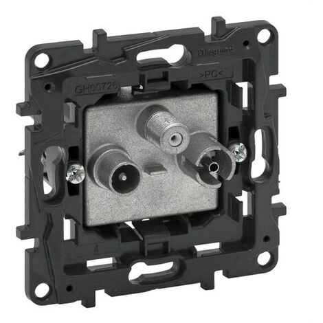 Base de télévision TV- R -SAT – Intermédiaire – Pour la distribution de signaux de télévision et de radio – Tous types d’opérateurs (TNT, câble, satellite) – Conformément aux directives européennes EN 50083-4 et EN 50083-2 – Compatibilité HDTV et Réseaux LTE – Bases blindées pour éviter les interférences avec les réseaux mobiles 3G et 4G – TV: connecteur mâle (9,5 mm) – R: connecteur femelle (9,5 mm) – SAT: connecteur type «F» – Câble coaxial recommandé: 17/19 VATC – Bande de fréquence: -TV: 5-68/120-862 MHz – R: 87,5-108 MHz – SAT: 950-2400 MHz – Atténuation inférieure à 14 dB – À équiper d’une finition panneau avant et plaque de finition – Montage encastré ou en surface – Fixation à l’aide de vis ou de griffes (incluses avec le mécanisme) – Livré avec un protecteur en plastique pour la protection lors de l’installation